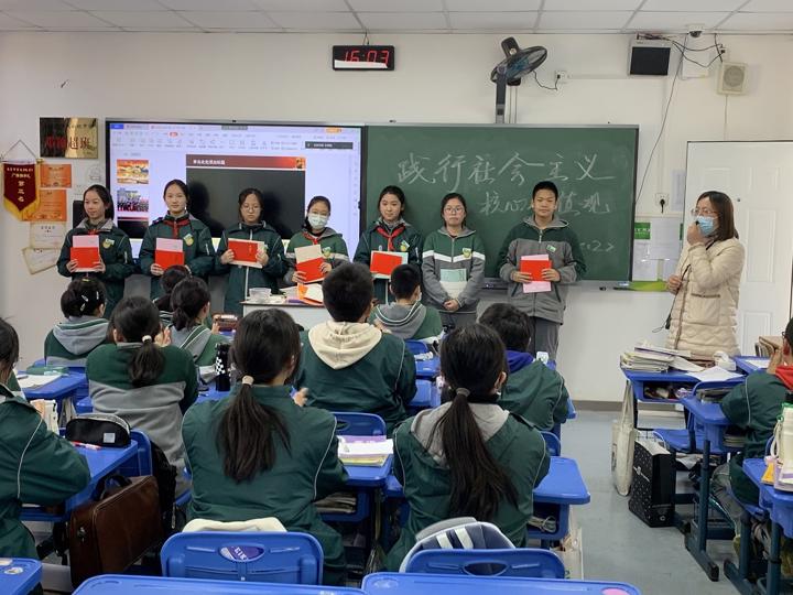 敬业方面,刘佳铭和施佳妍同学表演了生活情景剧:敬业的老师,让同学们感受到了我们老师对待工作认真负责、敬业的态度。启发同学思考:作为中学生,我们的“业”是学业,应该怎样做才是敬“业”呢?并请同学来谈一谈感想,加之以具体的行动指导。