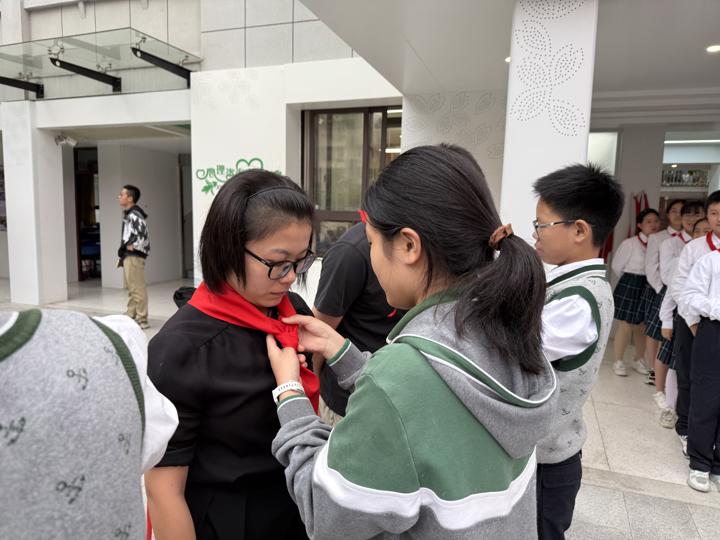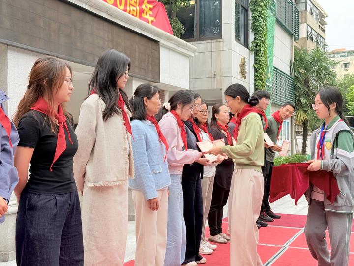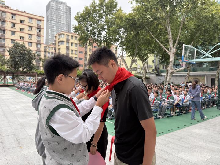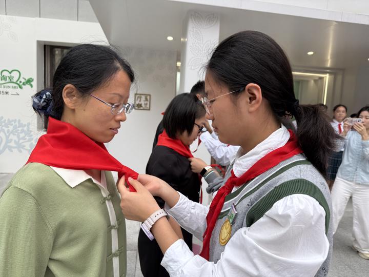 德育处朱玉锦副主任宣读了2025 级中队辅导员名单,万莉校务委员为新一届中队辅导员颁发聘书;少先队员代表为辅们员佩戴红领巾,感谢老师们将以 “引路人”“守护者” 的身份,陪伴队员成长。