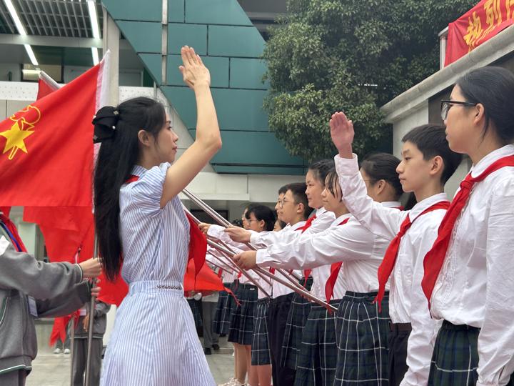 大队辅导员余芮老师为初一各中队授队旗,各中队代表昂首接旗,接过的不仅是旗帜,更是新时代少年的责任与担当。