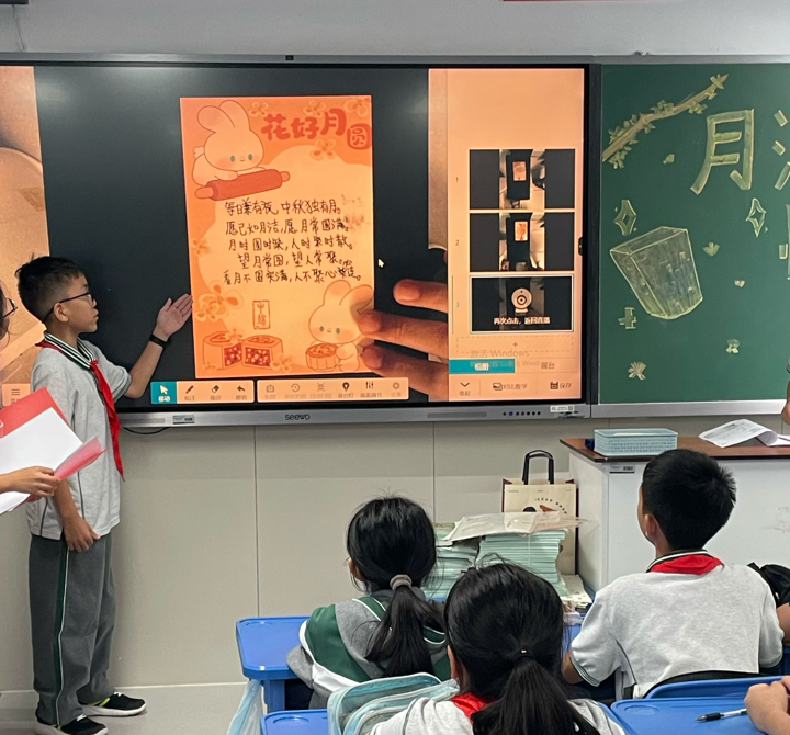 首先是徐轩哲同学带来的《水调歌头》朗诵。“明月几时有?把酒问青天…… 但愿人长久,千里共婵娟”,他身着整洁的校服,以饱满的情感、抑扬顿挫的语调,将苏东坡在中秋夜对亲人的思念与对人生的豁达诠释得淋漓尽致。短短几分钟的朗诵,让同学们仿佛穿越千年,沉浸在古典诗词的意境中,深刻体会到中秋 “团圆” 主题的文化重量。
