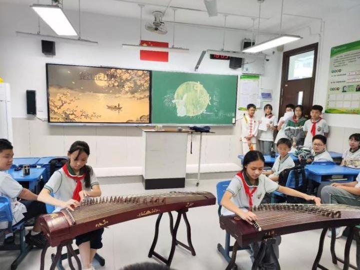 随后,敬自清、胡笳萱两位同学合作演绎《春江花月夜》。她们将这首经典作品的静谧、空灵与诗意传递给在场每一位师生。演奏过程中,教室格外安静,同学们静静聆听、欣赏,仿佛置身于 “春江潮水连海平,海上明月共潮生” 的唯美画卷中,进一步感受着中秋与传统文化的交融之美。节目展演结束后,班会进入轻松热闹的游戏环节。此次游戏以 “中秋猜谜” 为主题,精心准备的谜题逐一呈现在屏幕上,互动时间里,同学们热情高涨。“明天日全食(打一字)”“中秋朗月,宾主共赏(打二字礼貌用语)”“嫦娥下凡(打一字)”…… 每道谜题刚公布,同学们便纷纷举手抢答,有的低头思索,有的与同桌小声讨论,教室瞬间变成欢乐的海洋。当主持人公布答案,并解释谜题背后的巧思 —— 如 “举头望明月(打一中药名)” 的 “当归”,暗含 “抬头望月盼归” 的情感;“中秋月饼(打一电脑名词)” 的 “软盘”,结合了月饼的口感与盛放器具 —— 时,同学们恍然大悟,现场笑声不断。这场猜谜游戏不仅考验了大家的知识储备,更让同学们在互动中感受到中秋文化的趣味性,进一步拉近了彼此的距离。