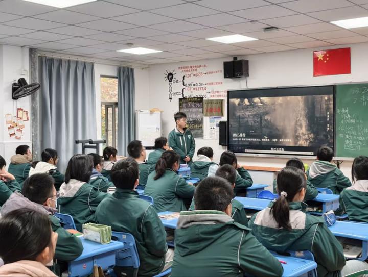 随后,主持人介绍了侵华日军南京大屠杀遇难同胞纪念馆中的水滴装置——每一滴水珠落下,都象征着一位无辜同胞的逝去,直观又沉重的意象让在场师生更真切地体会到战争带来的深重灾难,深刻铭记那段山河破碎的岁月,进一步坚定守护和平的信念。