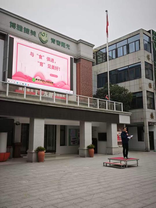 为深化食育教育内涵,优化校园餐饮服务,2026年1月5日,南京市第九初级中学总务处钟灼寰主任为大家带来以“与‘食’俱进,‘育’见美好”为主题的晨会。融合传统文化、校园餐调研、实践体验等多个维度,让学生在探索与参与中感受饮食文化的魅力,同时推动校园餐饮服务的优化升级。