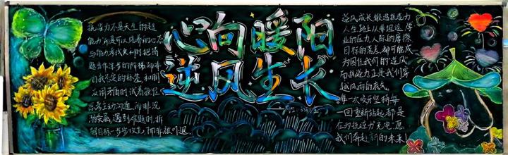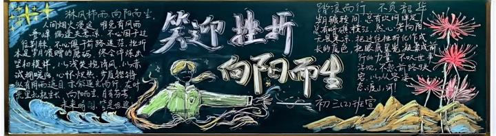 除了精彩纷呈的演讲比赛及晨会展示,初三年级抗逆力主题黑板报创作活动同样亮点满满。各班级围绕“抗逆成长”“直面挑战”“青春无畏”等核心,发挥创意巧思,精心设计版面、绘制生动插画、撰写励志感悟。一块块黑板报色彩鲜明、图文并茂,既有激励人心的名言警句,也有贴近成长的挫折应对方法,更有学子对“抗逆力”的独特理解,成为校园里一道靓丽的青春风景线,让抗逆成长理念在潜移默化中浸润心灵。