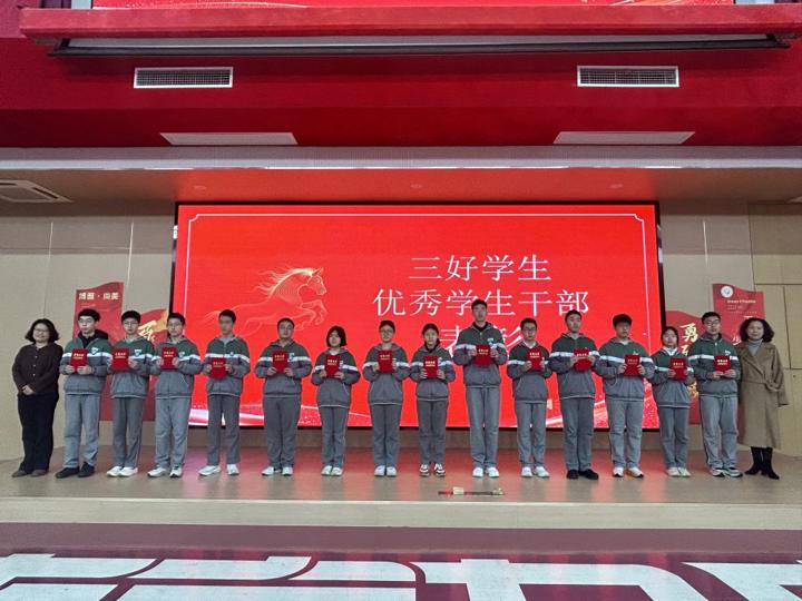 万莉校务委员、代怀安副校长宣读了三好学生及优秀学生干部表彰名单,王艳飞校长、代怀安副校长、焦志华副校长、梁伟副校长、陈晶晶副校长、王鹏校务委员为获奖代表颁奖,鼓励全体同学以榜样为帆,奋勇争先,共赴新程。