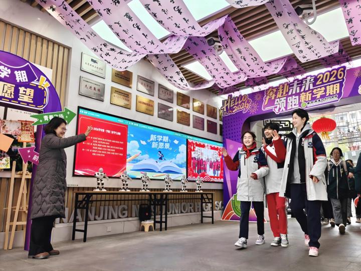 同学们亲手制作的新年贺卡和新学期心愿卡悬挂在门厅两侧,一笔一画承载着对新年的美好期许与对未来的无限憧憬;