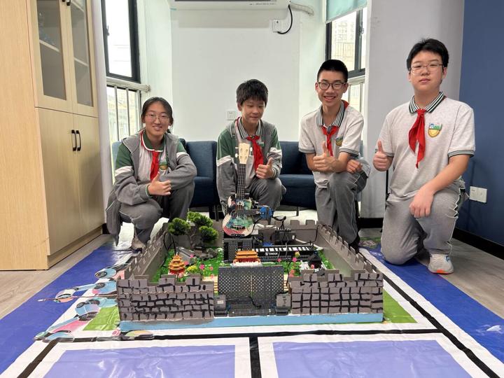 备赛期间,在指导老师的悉心带领下,团队成员:高弘毅、张景略、宋熠玹、薛明灿分工协作、刻苦钻研,以南京六朝古都的历史底蕴为内核,通过机器人巡线技术与手工DIY制作,实现明城墙等地标的数字化创新表达。从创意构思、巡线调试到实物制作,每一个环节都反复推敲、精益求精,队员们放弃休息时间全力投入训练,展现出极强的凝聚力和钻研精神。